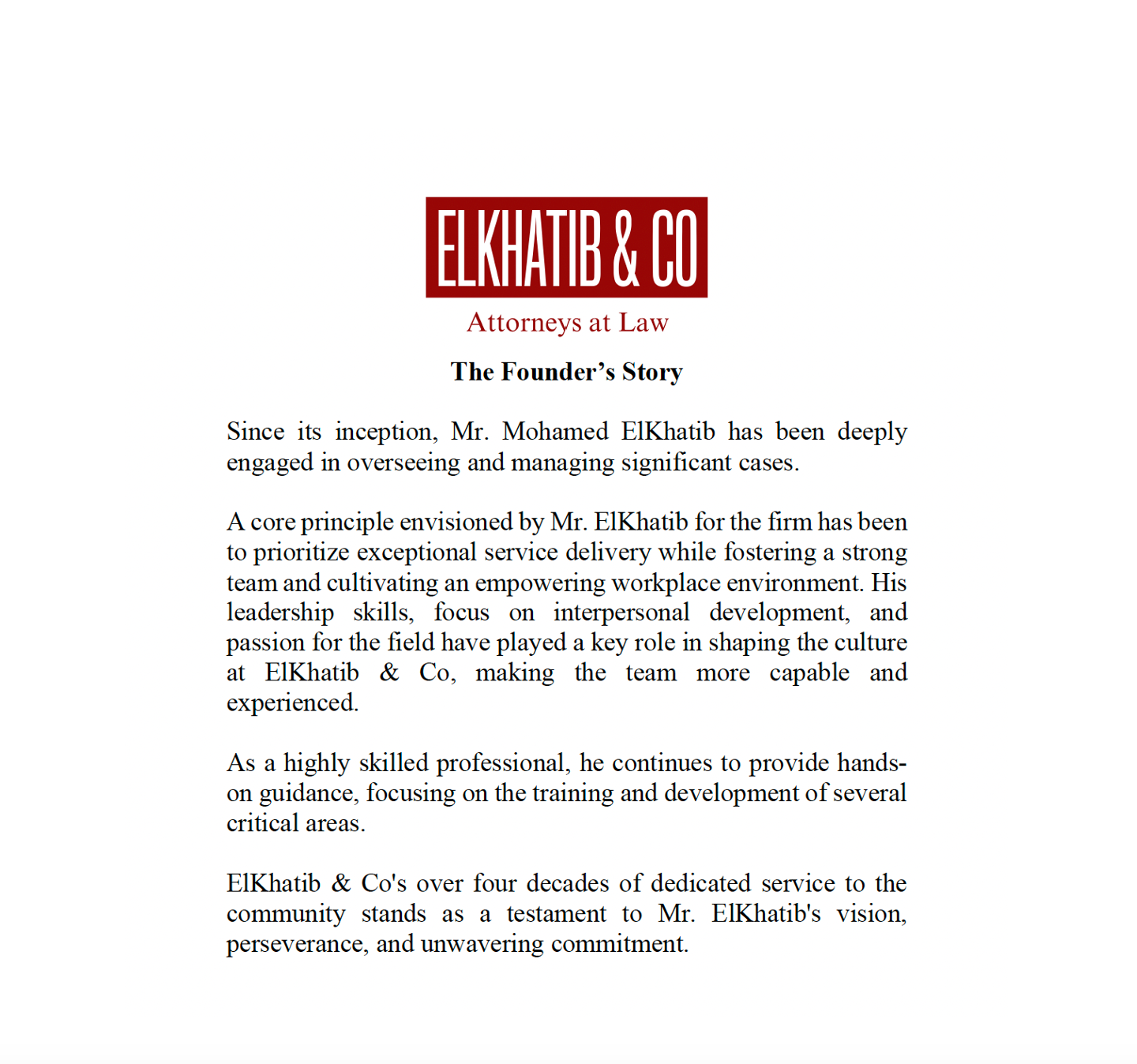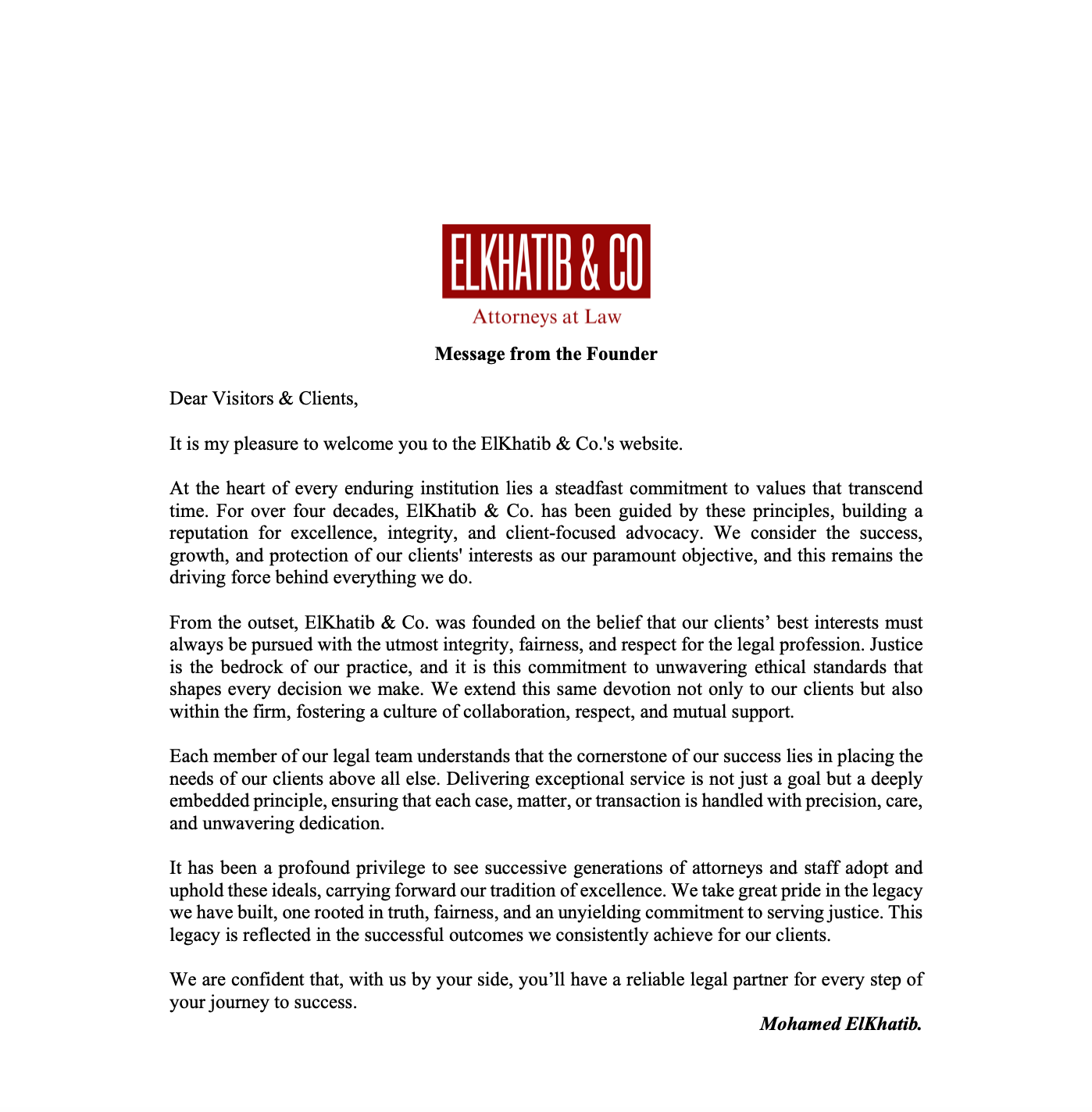 ElKhatib & Co was founded with a clear vision to establish a globally recognized law firm that champions the rights and interests of its clients. Our Founder and Managing Partner established the firm to provide unparalleled legal expertise, uniquely tailored to each client's situation and aspirations.